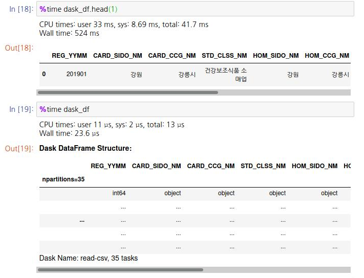 그래서 단순히 dask_df 를 출력하면 데이터의 값을 보여주지 않고 dask_df.head()를 하면 값이 보입니다.